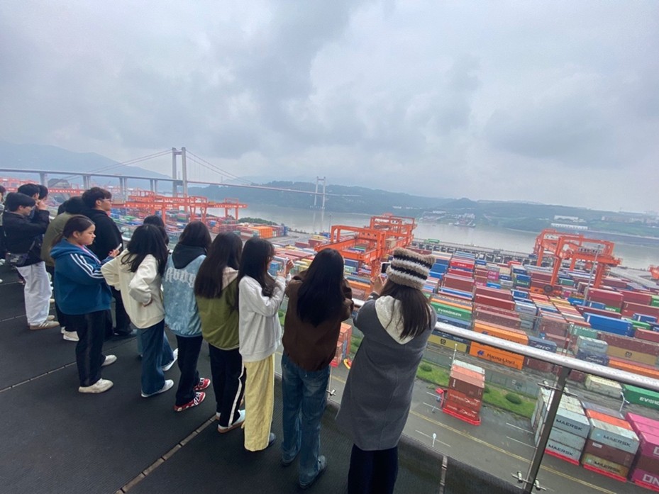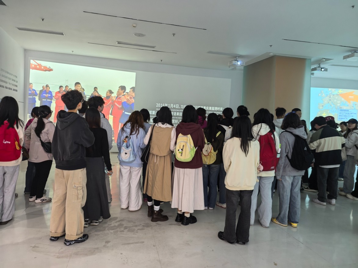 首先,在果园港多式联运智慧运营中心展厅,同学们跟随讲解员系统了解了果园港从内河小港发展为国家级物流枢纽的历程。通过智慧沙盘、实时追踪系统等展示,让学生对“多式联运”、“智慧物流”等抽象概念有了具象认知。学生在现场不时驻足记录、踊跃提问,展现出浓厚的学习兴趣。