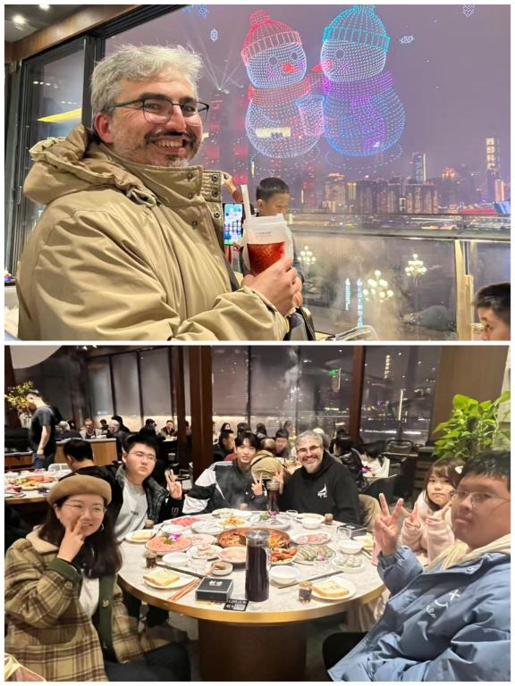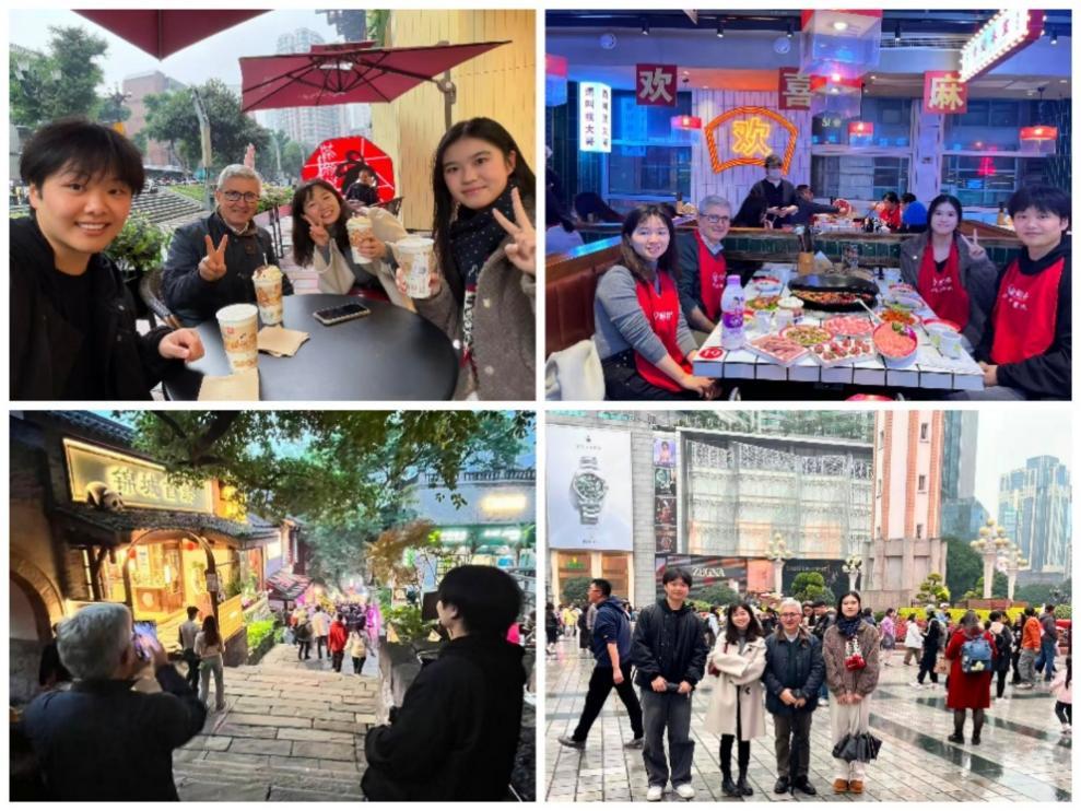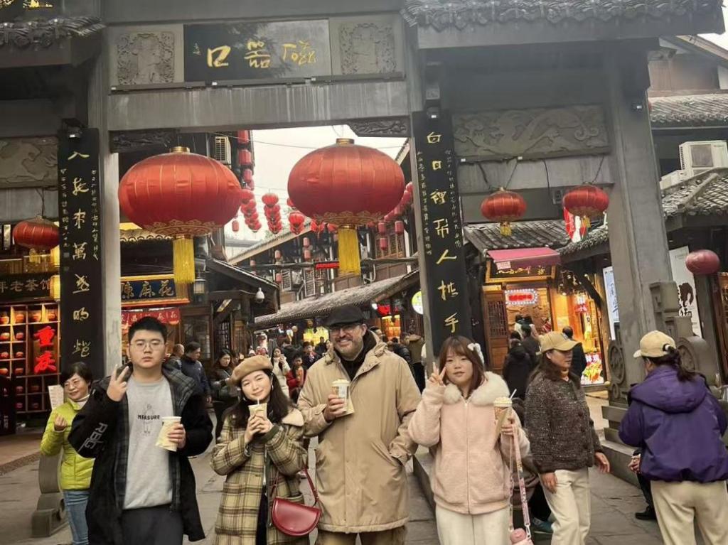 四位同学与西班牙外教 Vicente 共同开展跨文化城市探索活动,涵盖磁器口古镇探访、川渝变脸观赏、本土话剧观看、长嘉汇无人机表演欣赏及重庆火锅与特色茶饮体验。在磁器口,同学们向外教介绍古镇历史、特色美食与蜀绣、竹编等非遗技艺;川渝变脸表演让 Vicente 驻足录制,主动询问艺术渊源与表演技巧;本土话剧中的重庆方言与地域习俗,让他直观感受当地生活场景;无人机表演呈现的城市地标与文化符号,搭配两江夜景令人沉醉;重庆火锅宴上,双方围绕中西饮食文化展开热烈讨论。Vicente 表示,多场景体验让他对中国文化与城市发展有了更具体的认知,参与学生也在双语沟通中提升了跨文化交流能力,深化了自身文化认同。