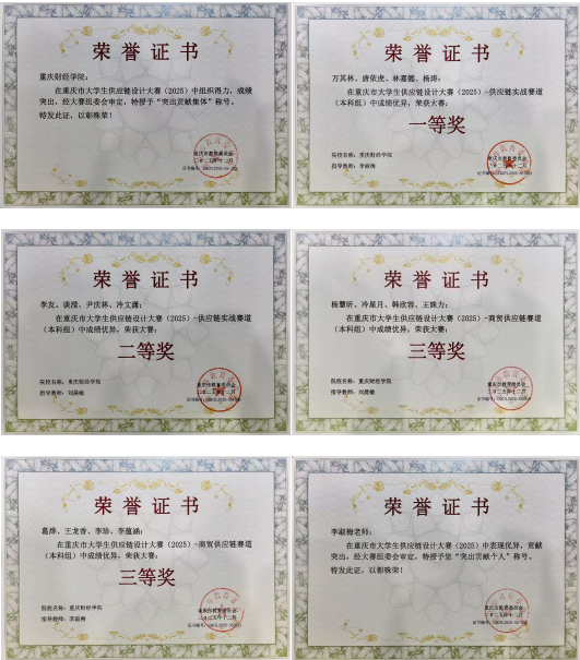为深化物流供应链专业人才培养,以学科竞赛推动专业建设与教学改革,切实提升学生的实践应用与团队协作能力,重庆财经学院物流工程学院组织开展2025年重庆市大学生供应链设计大赛校园选拔赛,并选派优秀队伍代表学校参加市级赛场,最终斩获市赛一等奖1 项、二等奖1项、三等奖2项的优异成绩。